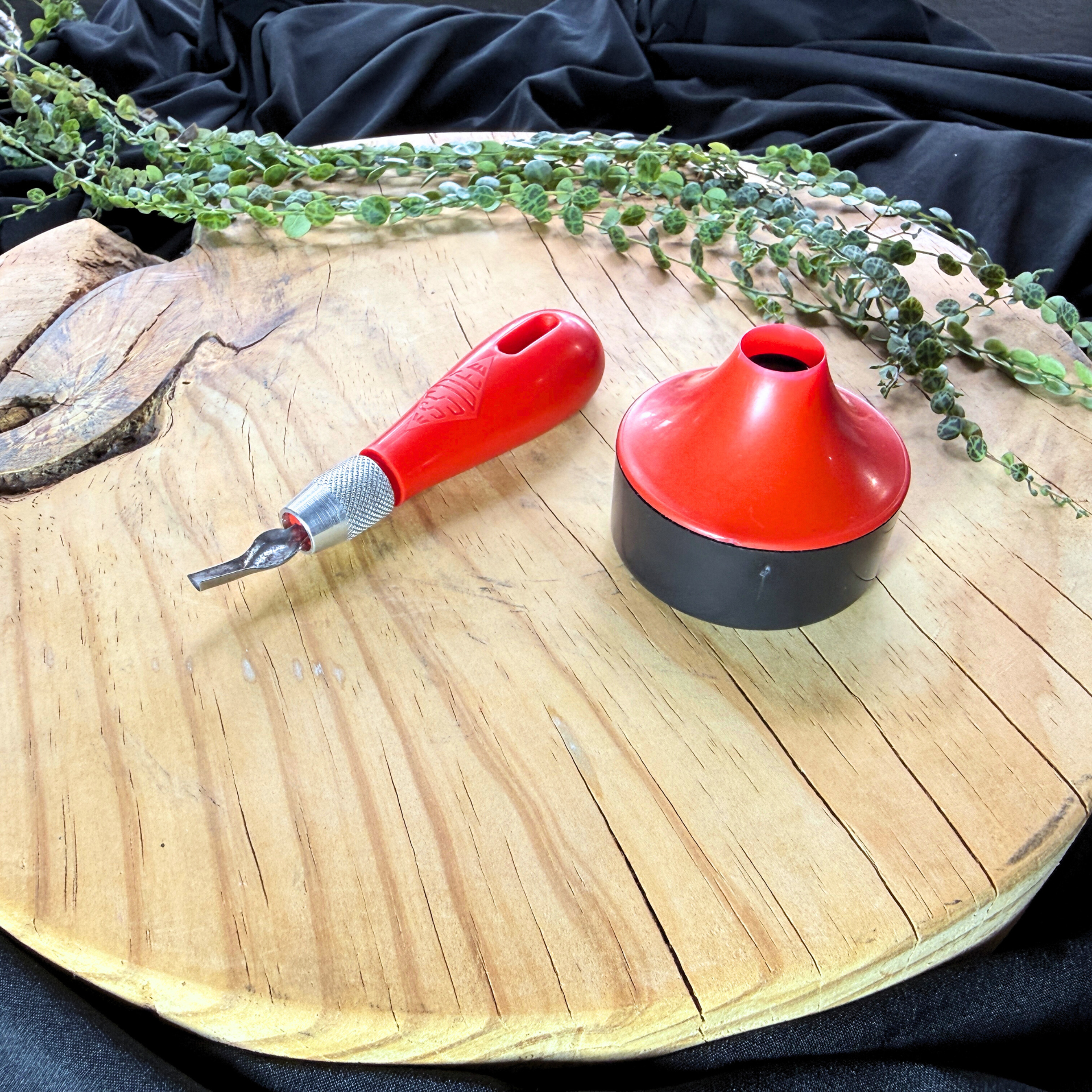 The Essdee Karving Tool – Full Tool Set combines a solid, comfortable handle, a precision aluminium tightening band, a size 9 blade, and a blade container holding blades 1 to 5. Together, they give you the full range of marks needed to move from fine detail to bold, expressive carving without complication.