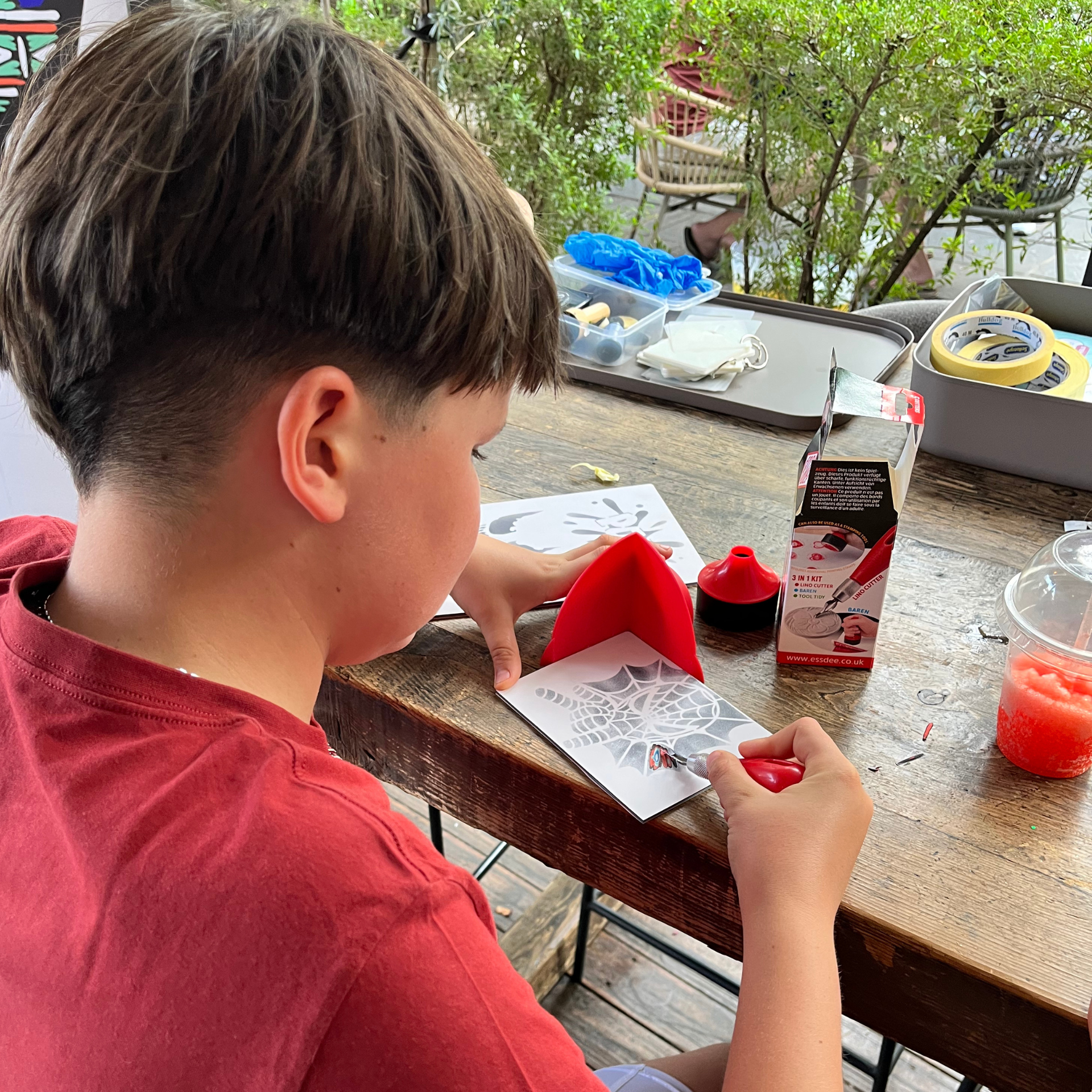 Ons wys jou eers hoe die proses werk met ’n kort demonstrasie. Daarna leer jy hoe om die gereedskap veilig te gebruik, hoe druk en hoek die kleur verander, en hoe om die lae in die vel te lees. Jy kan jou eie ontwerp skets, ’n stensil volg of sommer net intuïtief werk – jy kies jou tempo en styl.