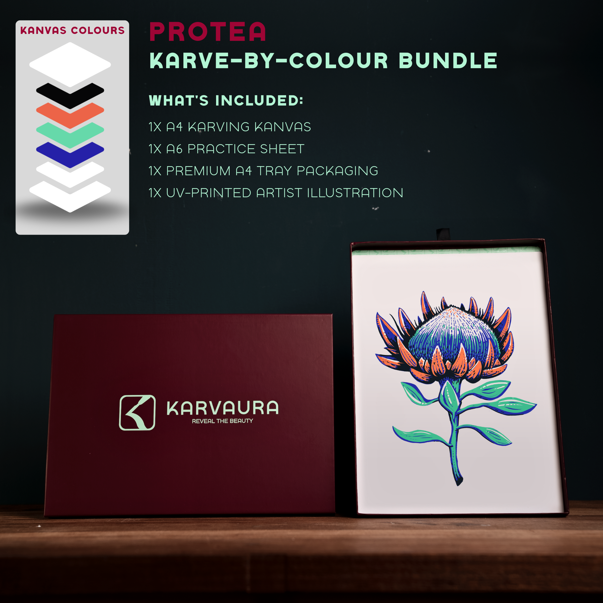 Step into the world of colour and creativity with the Protea Karve-by-Colour Bundle. This set lets you sketch your ideas, then cut and karve to reveal stunning colours layer by layer – no paint or mess required. The included Protea Halo illustration is UV-printed right on the Kanvas, making it easy to follow or add your own creative twists.