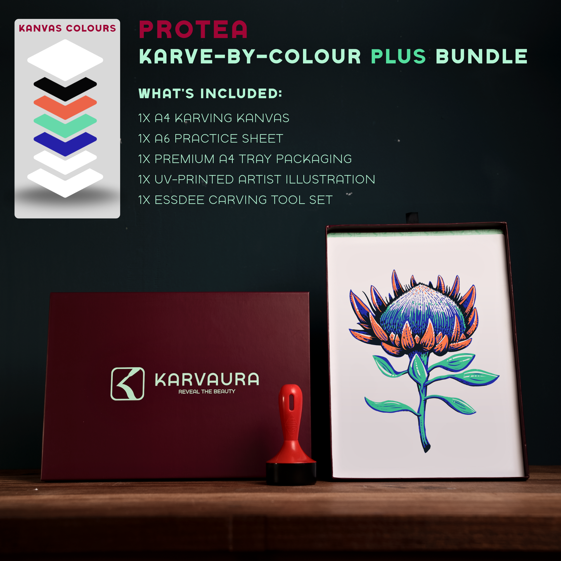 Get the full Protea experience – all the art, colour, and tools you need to dive in right away. No experience needed: simply sketch, cut, and karve along the printed lines or add your own creative touch. Reveal vibrant colours and create your own version of the iconic Protea.